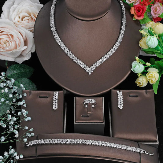 Flower Cubic Zirconia Bridal Wedding Jewelry Sets for Women Simple Design Necklace Earrings Bracelet Ring