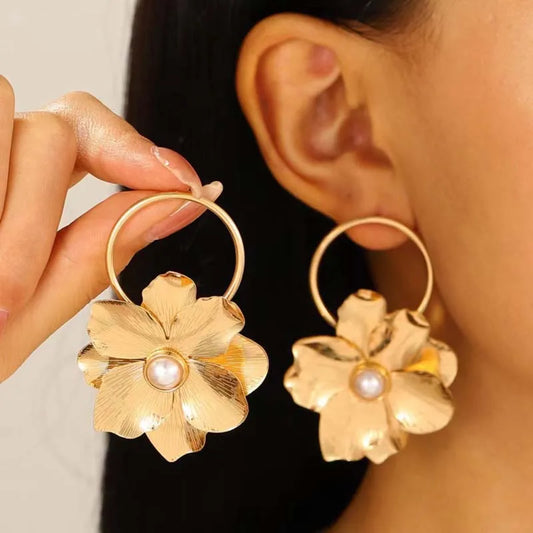 Exaggerated Metal Pearl Flower Drop Earrings for Women Fashion Gold Color Big Flower Personalized Dangle Earrings Jewelry 2024