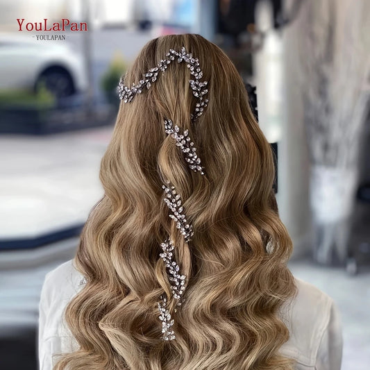 TOPQUEEN Handmade Wedding Hair Vine Silver Rhinestone Bridal Headband Long Women Headwear Wedding Party Hair Accessories