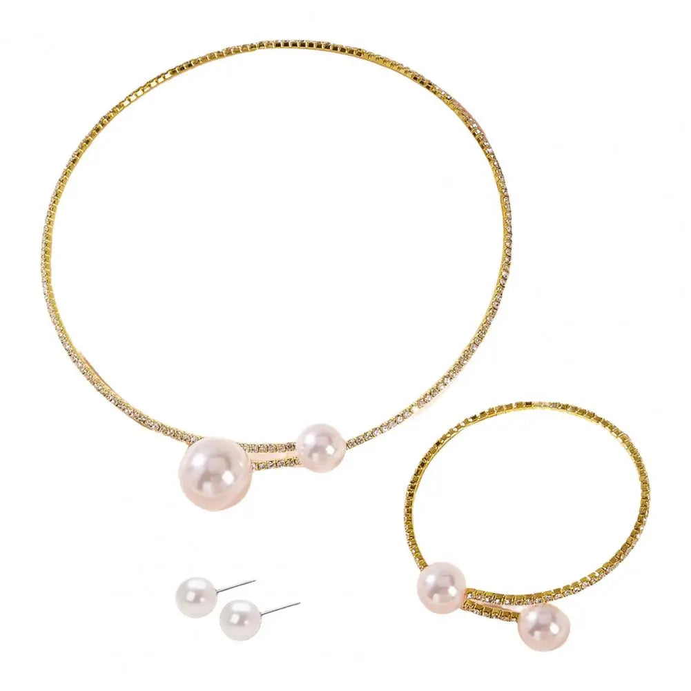 1 Set Women Jewelry Set Faux Pearl Polished Contrast Color Opening Rhinestone Body Decoration Adjustable Ear Stud Clavicle Neckl