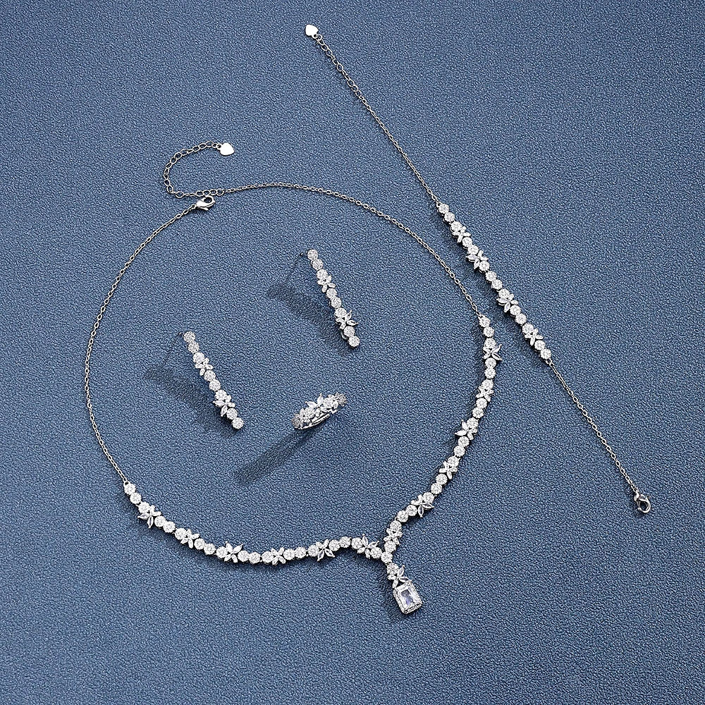 Celebrate your special day with the Bridal Jewelry Set. This elegant four-piece set features a geometric design, crafted with high-quality cubic zirconia stones that radiate timeless beauty and brilliance. The durable copper metals ensure a long-lasting shine, while the trendy style adds a modern, sophisticated touch to any bridal look. Perfect for brides who want to make a bold yet refined statement on their wedding day.