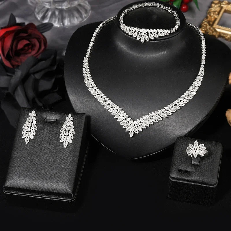 Complete your bridal look with the elegant Bridal Jewelry Set (Model 050). This set includes four stunning pieces crafted from high-quality cubic zirconia, offering brilliant sparkle and sophistication. The geometric design adds a modern touch to traditional wedding jewelry, making it perfect for contemporary brides. Made from copper for durability, this set is both fashionable and luxurious. Ideal for weddings, this trendy set will enhance your bridal beauty and create lasting memories on your special day.