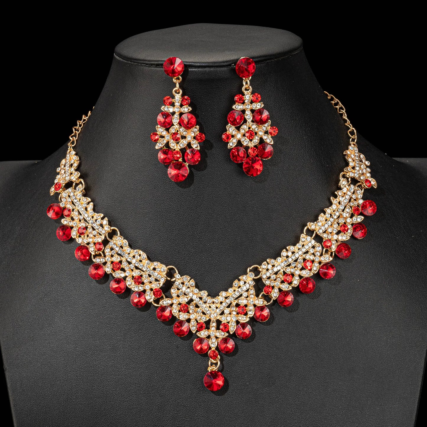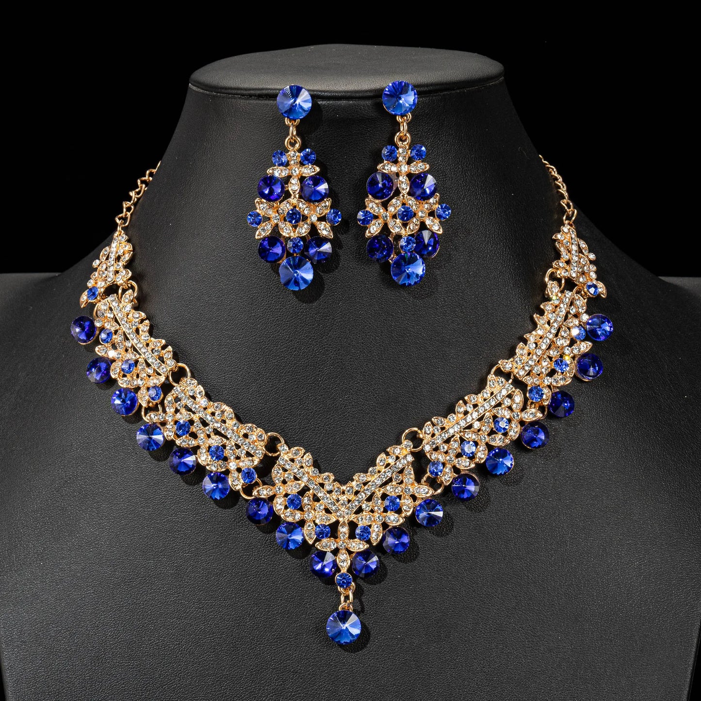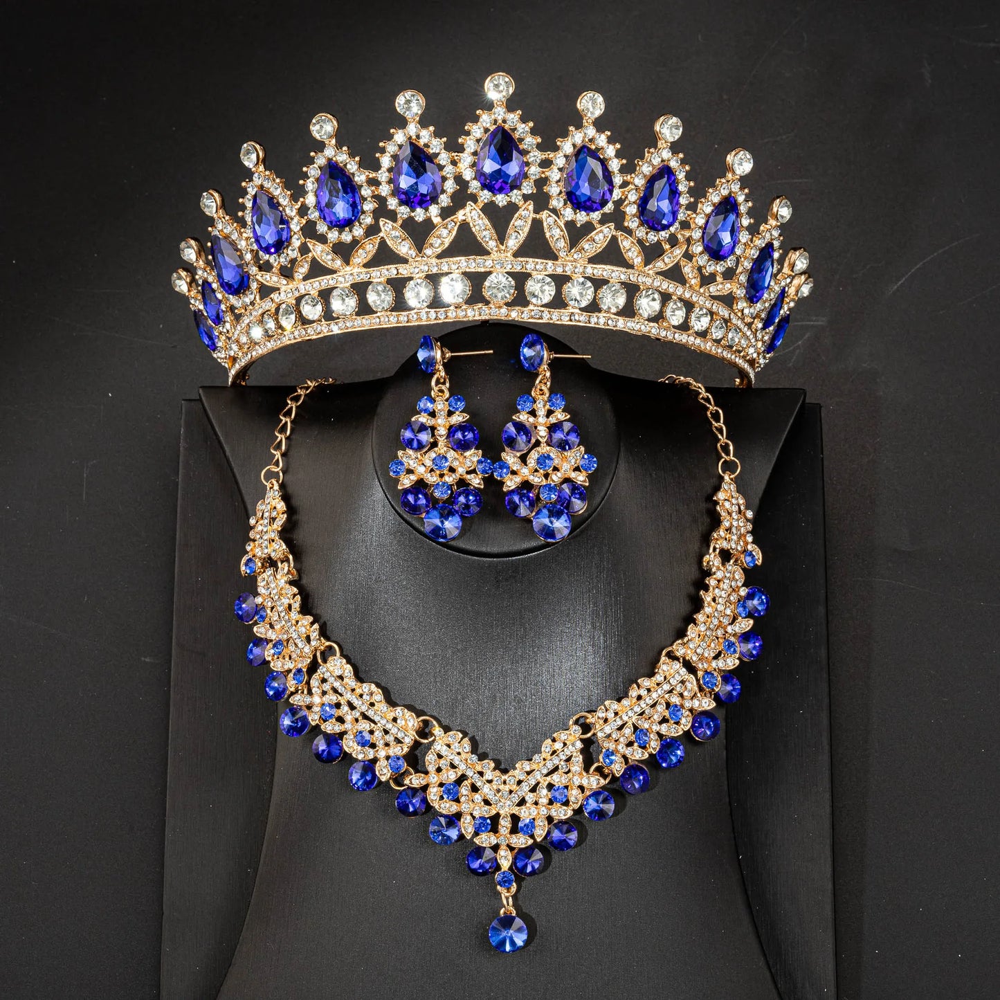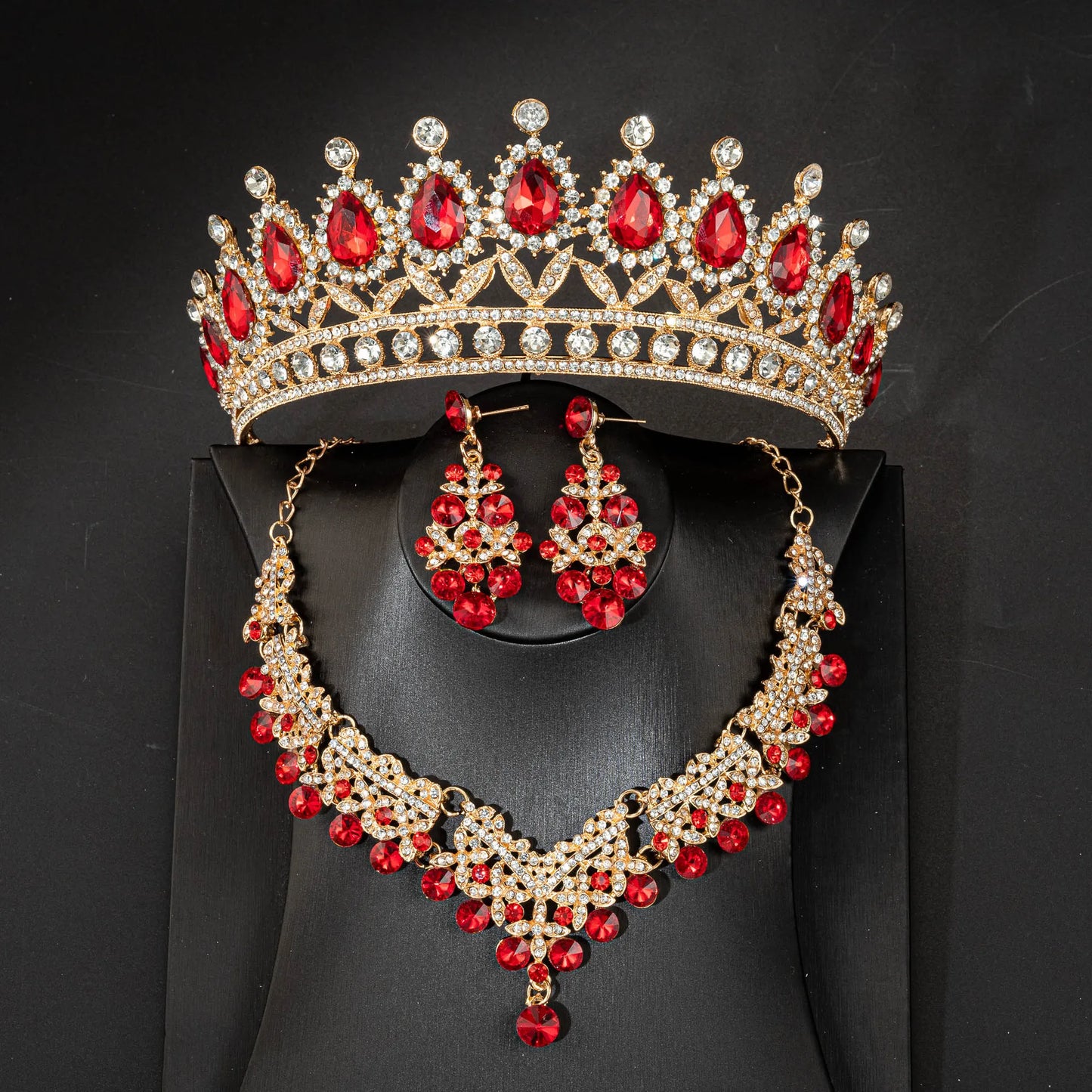 Crystal Rhinestone Bridal Tiaras Crown Women Queen Princess Purple Pink Red Blue Green Necklace Sets Fashion Jewelry Set Diadems