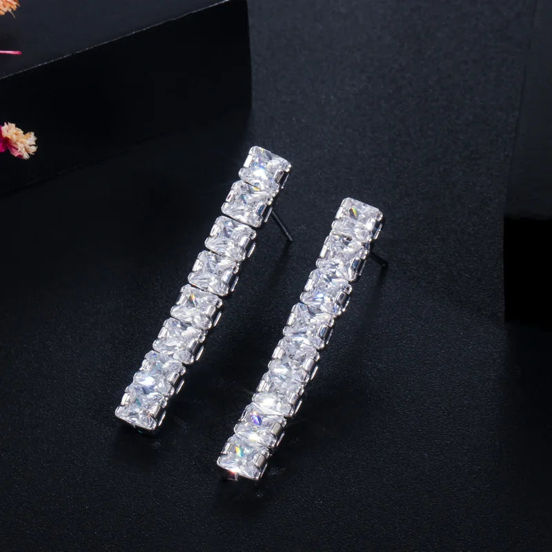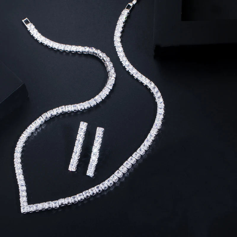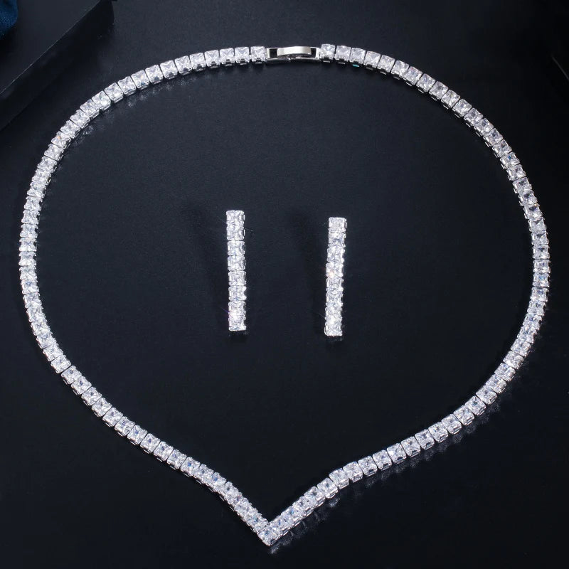 The CWW Zircons Bridal Jewelry Set exudes classic elegance, featuring a stunning pair of square cubic zirconia earrings and a matching necklace. The earrings measure 3.5 cm, and the necklace is approximately 45 cm in length, designed in a V-shape to complement the square-cut stones. Crafted from high-quality copper with a sleek silver-tone finish, this set is adorned with clear white cubic zirconia stones for a dazzling look.