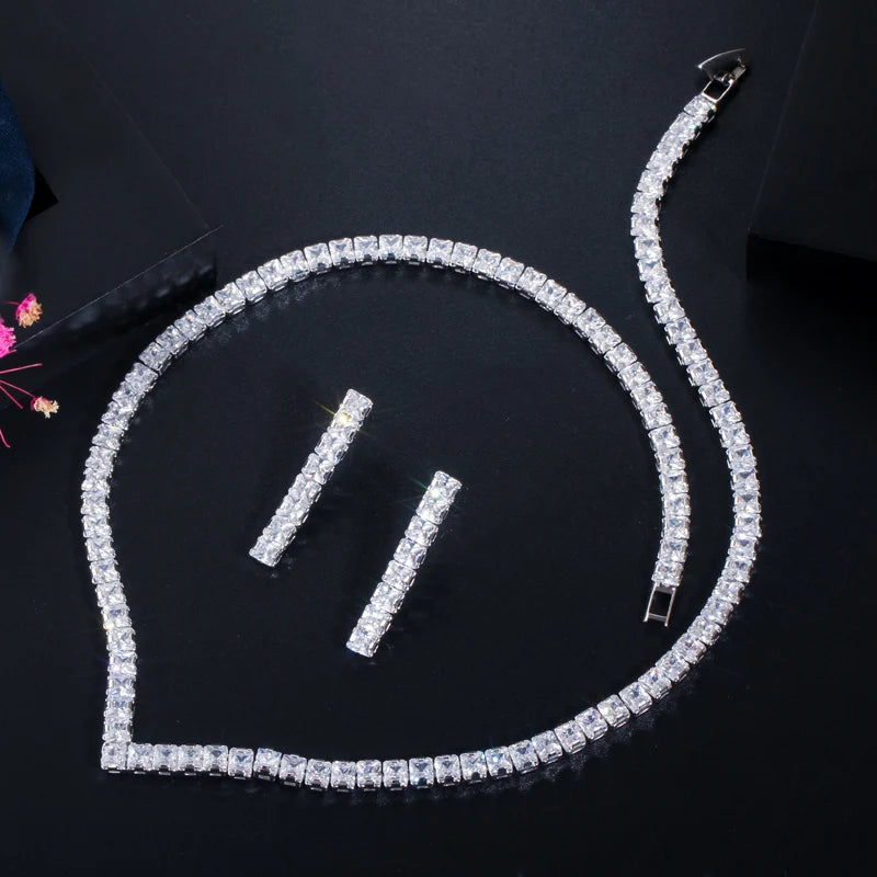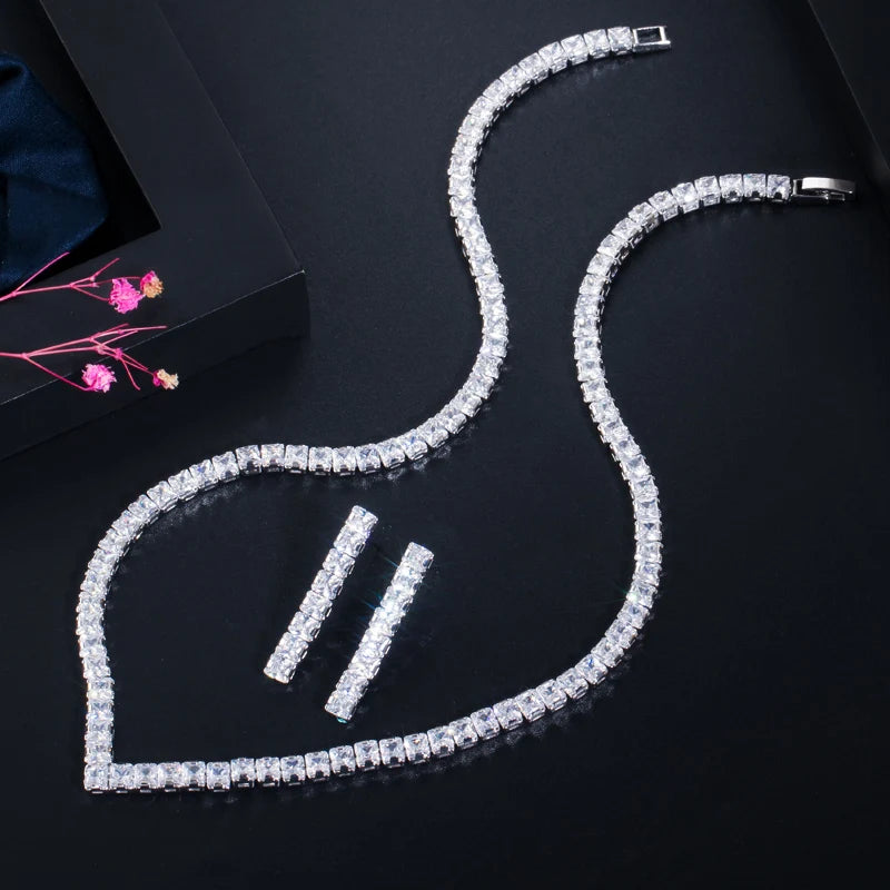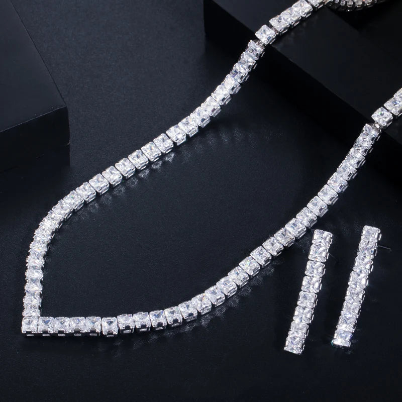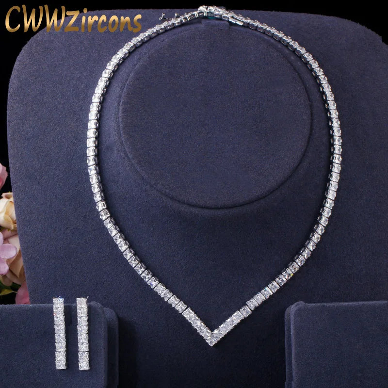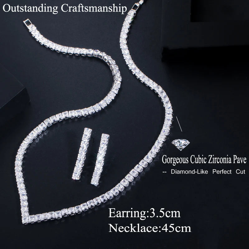 CWWZircons Sparkling Square Cut Cubic Zirconia Pave Women Party Costume Jewelry Wedding Earring Necklace Sets for Brides T409